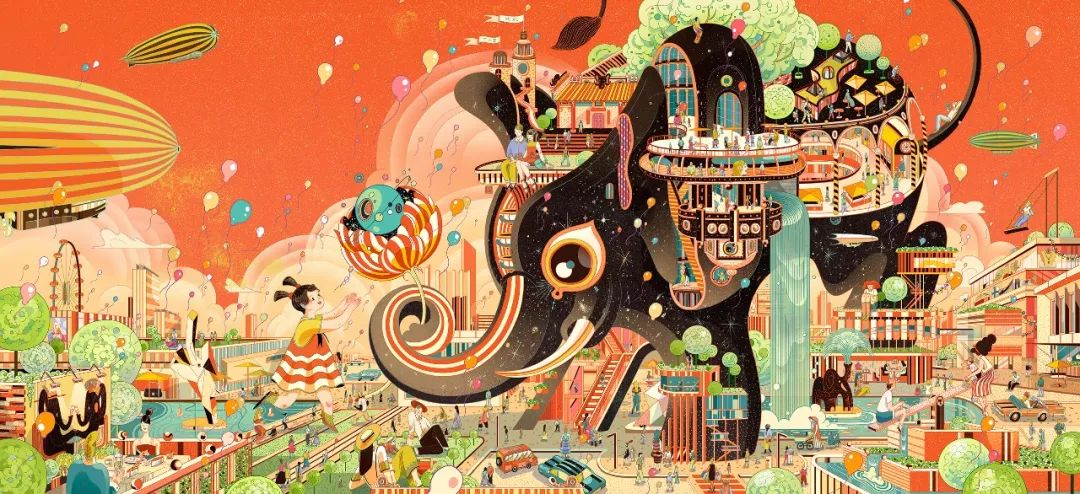 作品整个开业画中的群建筑根据万象天地实际的建筑群作为原点,加入了奇幻元素,通过游乐园愉悦的氛围,让人从画中体会到整个万象天地的灵气与创造力,无论男女老少来到这个空间都能像孩子一样充满好奇心地去探索游玩。
