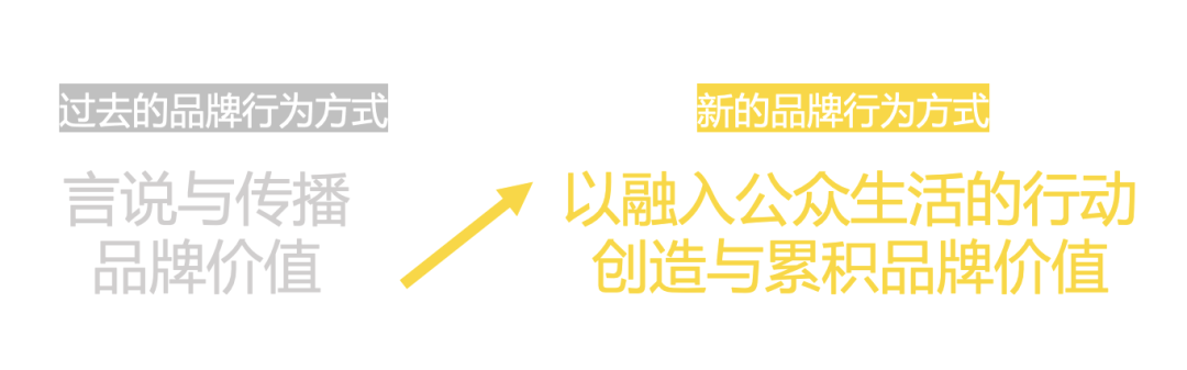 其二是品牌行为方式的变化。当单向的讯息传播越来越难以打动公众,以行动代替言说在今天变得更为必要。品牌需通过融入社会生活的行动获得公众关注,通过真实价值的创造建立认同。